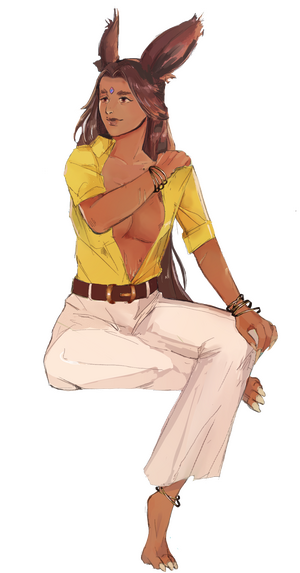 • Some may take note of her occasionally changing mane colour. As silver haired as most viera come, Rayne has turned to dyeing her hair after leaving the Wood.• The viera – while once notably muscular due to her often visible arms and legs – softened for nearly a year as a result of her pregnancy with her daughter. Since then, she has made a daily effort to regain her strength and form – and while not perfect, has managed back into better shape.• Her feet are digitigrade, as a result of her leporine biology – therefore inclining her toward heeled shoes at all times. As well does a tufted short tail rest nestled just at the base of her spine.